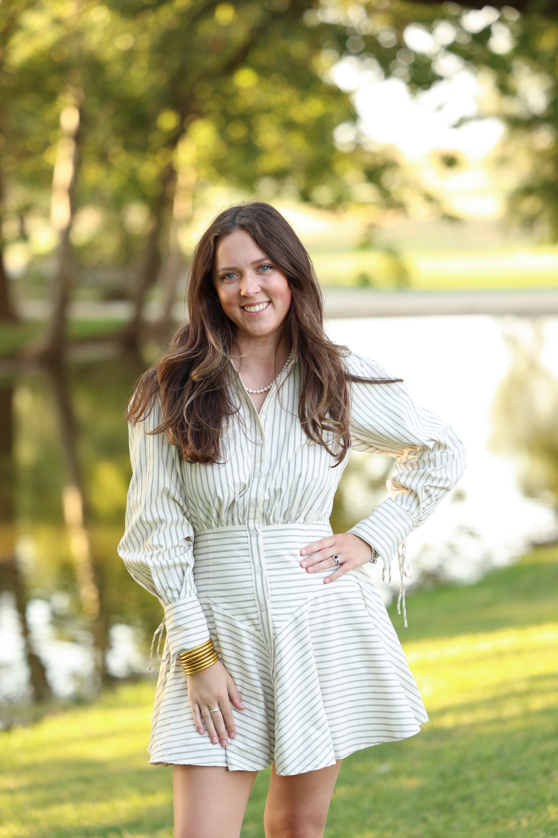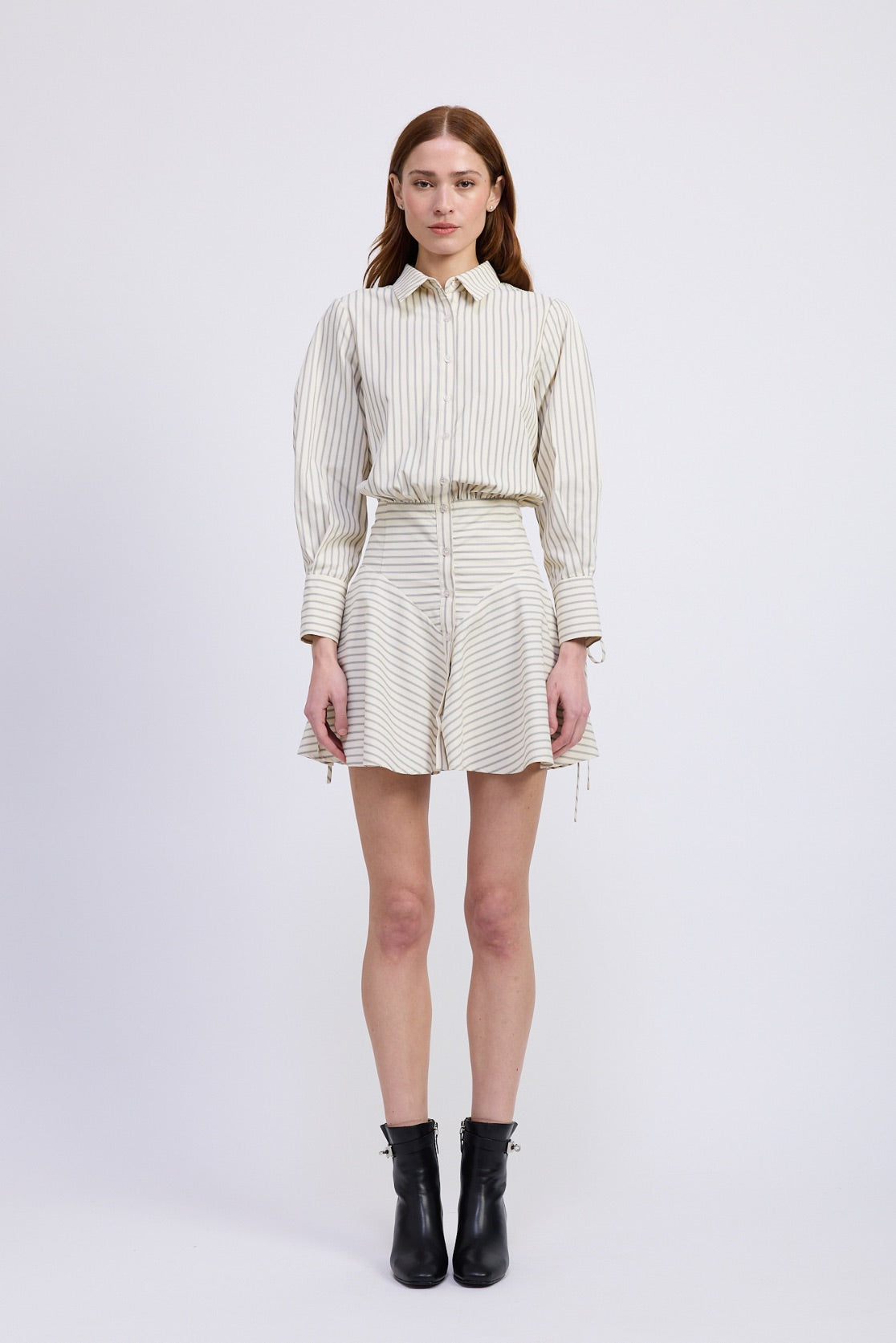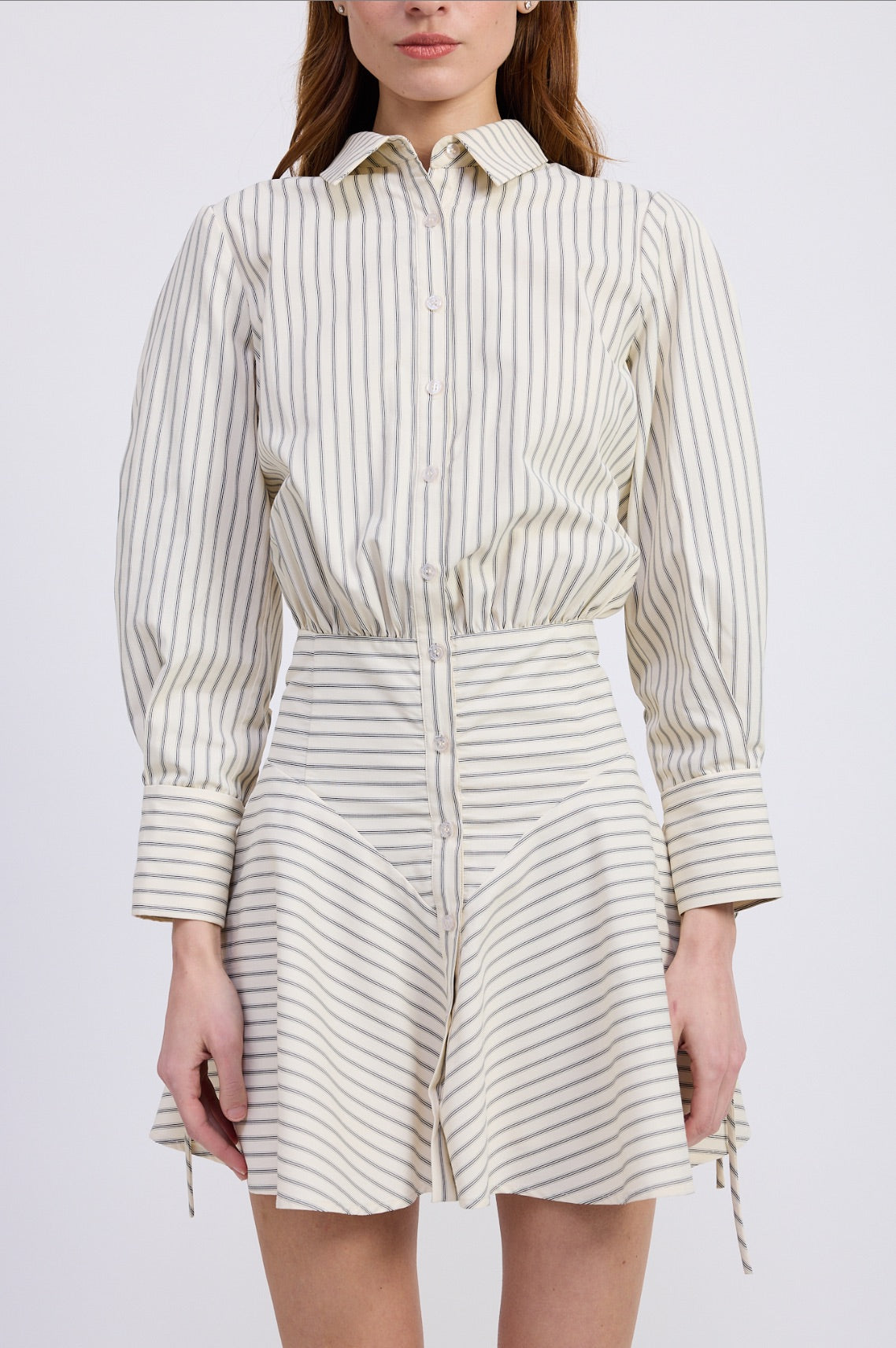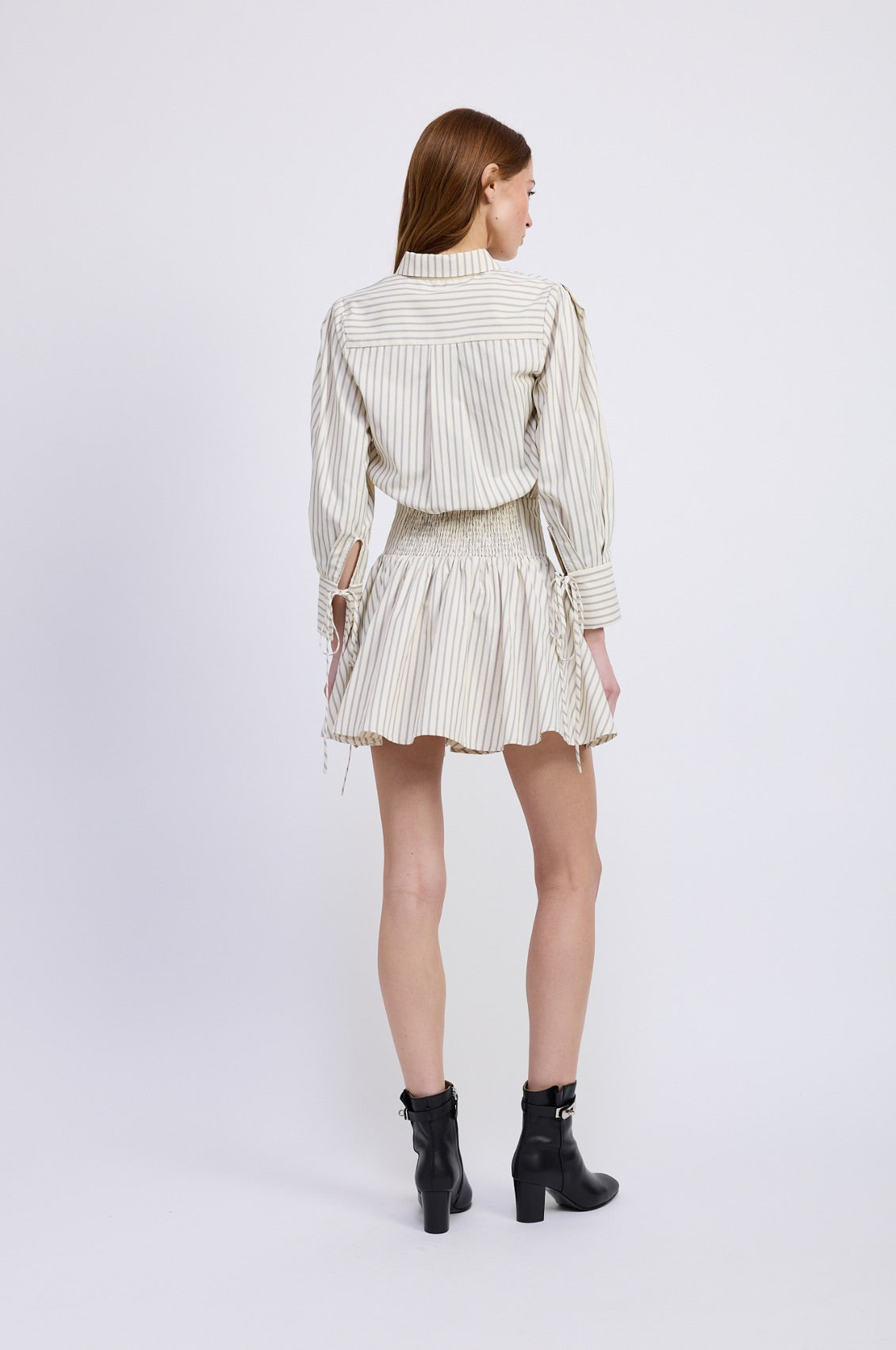 Light weight long sleeve mini dress. Features tie cuffs, fitted waist and button down front.