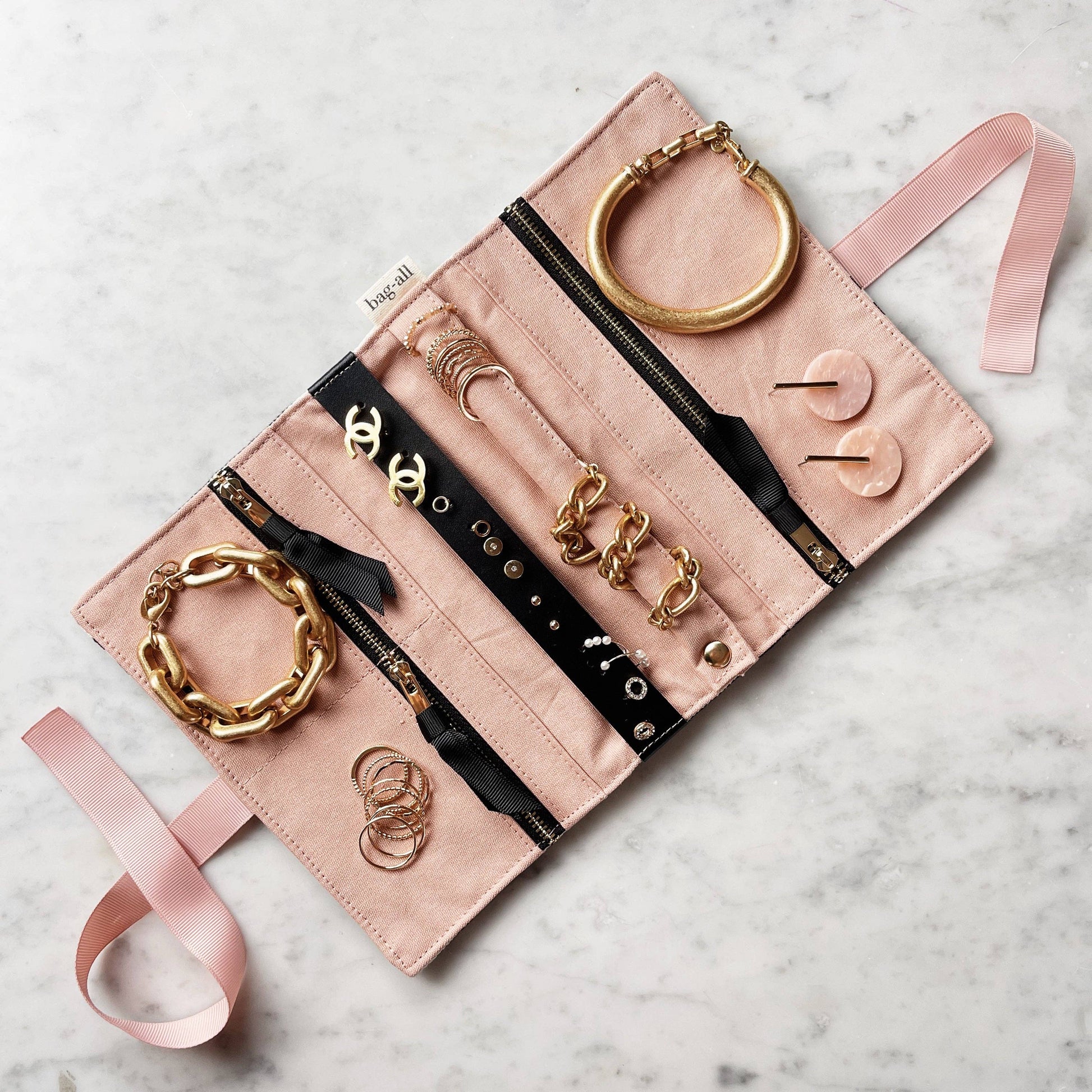 Say goodbye to tangled necklaces and misplaced earrings with our stylish Jewelry Roll Travel Pouch in our signature striped black and white fabric, with cute pink lining. Designed for both travel and home use, this organizer is a must-have for every jewelry lover. With three convenient zipper compartments, you can keep your precious accessories neatly organized and easily accessible. The genuine leather earring holder ensures that your earrings stay secure, while the padded ring holder keeps your rings protected. Plus, this sleek and elegant pouch can be effortlessly rolled up or unfolded. Invest in this functional and elegant solution to keep your jewelry untangled and effortlessly organized, wherever you go.