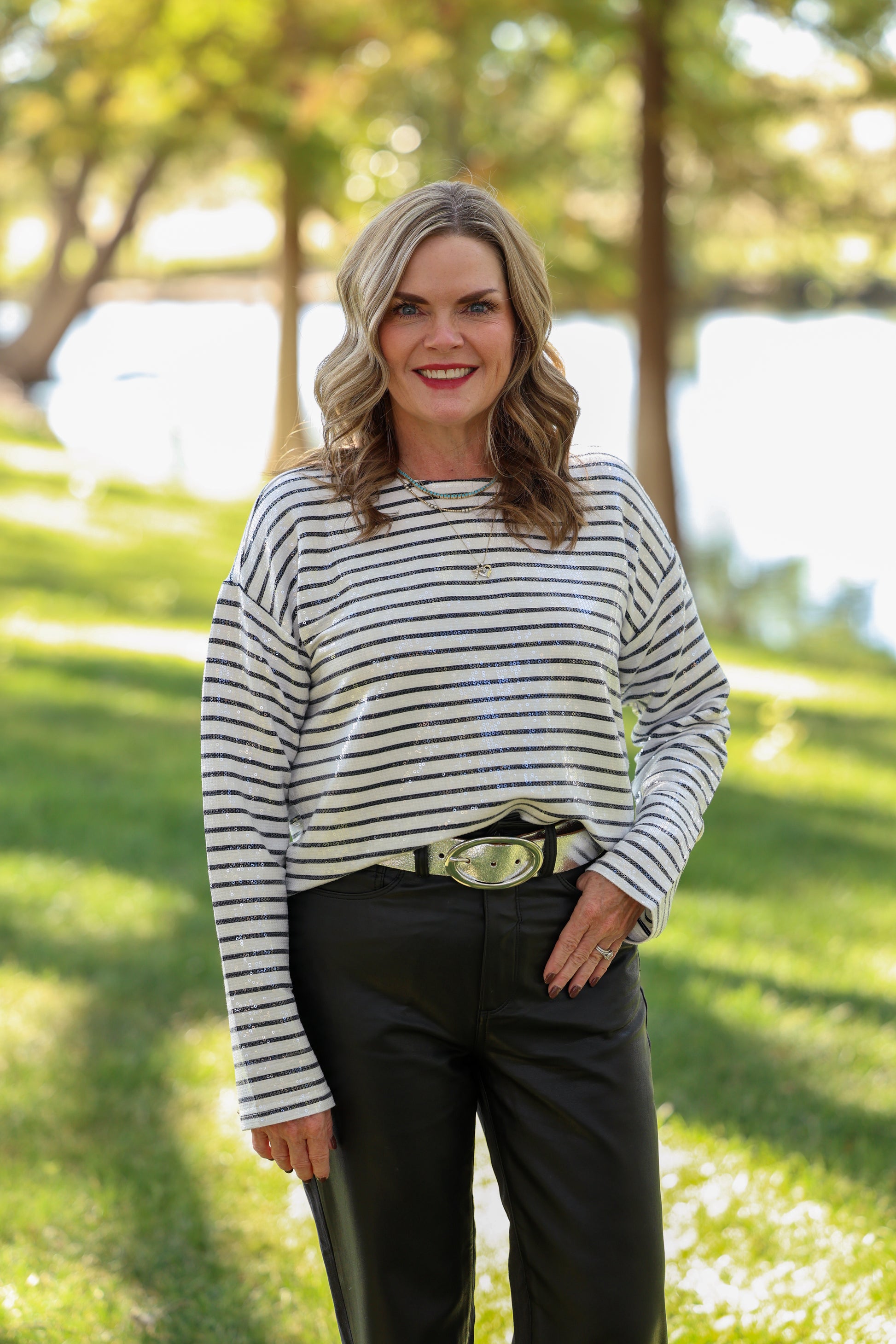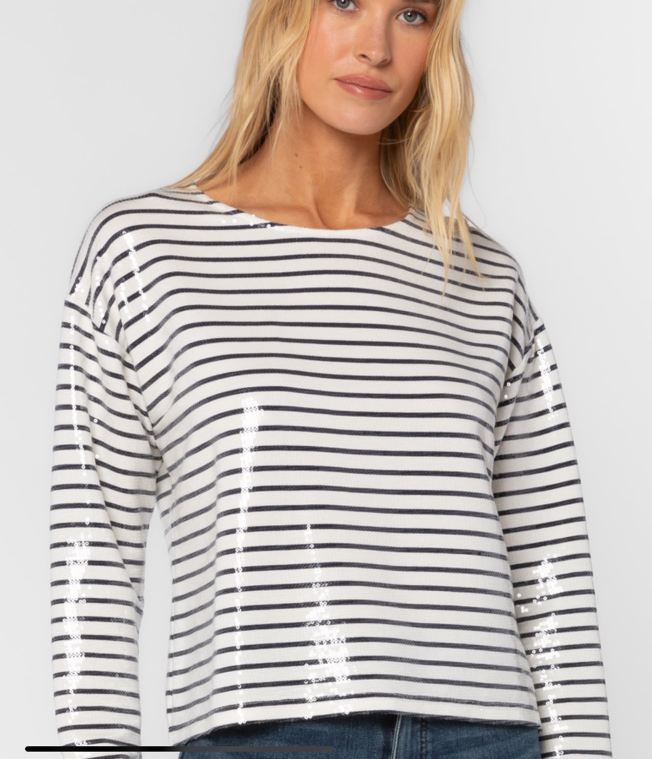 Long sleeve black and white stripe sequin top.