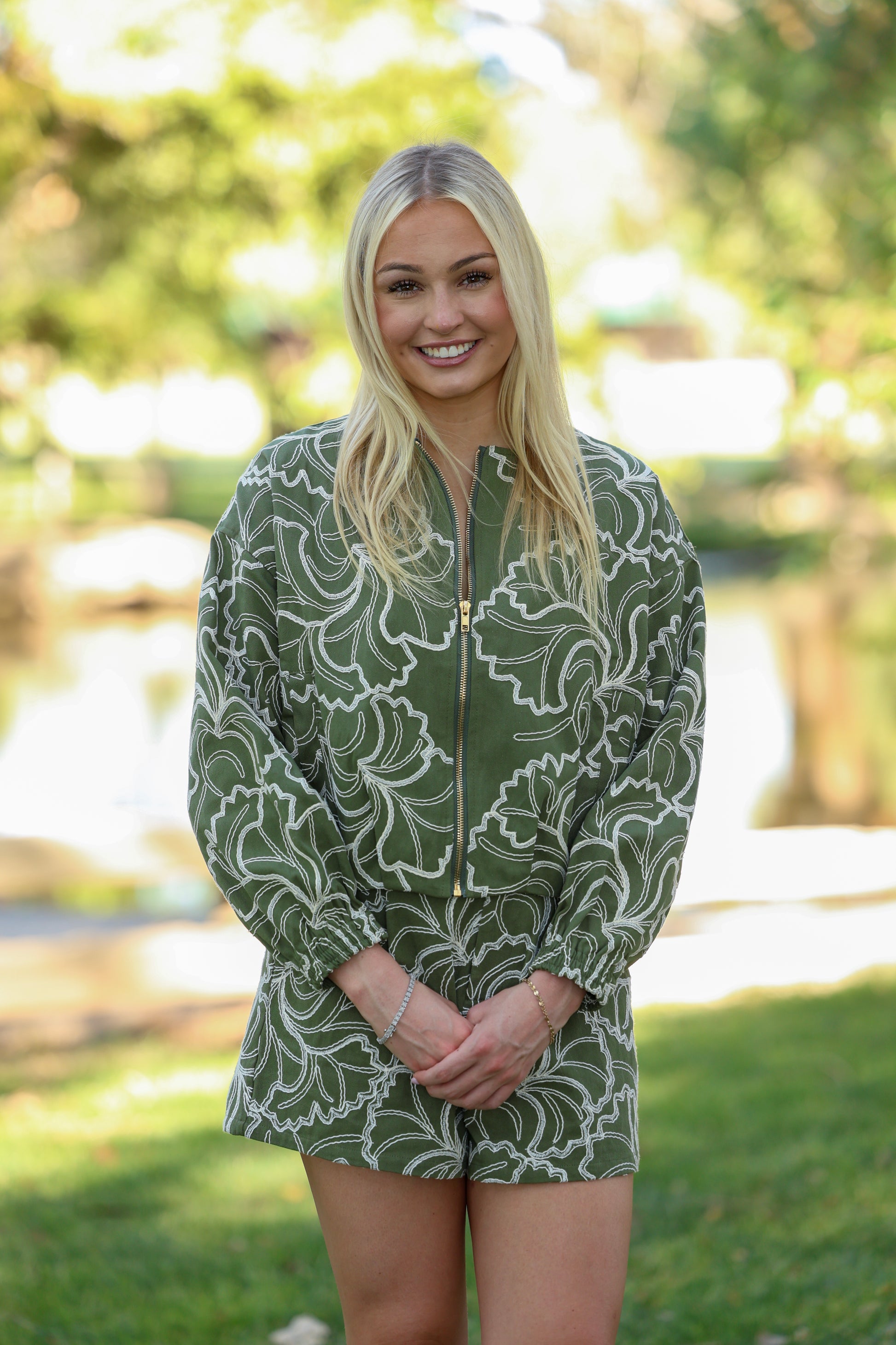 Textured long sleeve zip-up cropped jacket featuring floral embroidery. Side pockets. Lined. Woven. Non-sheer. Medium weight.