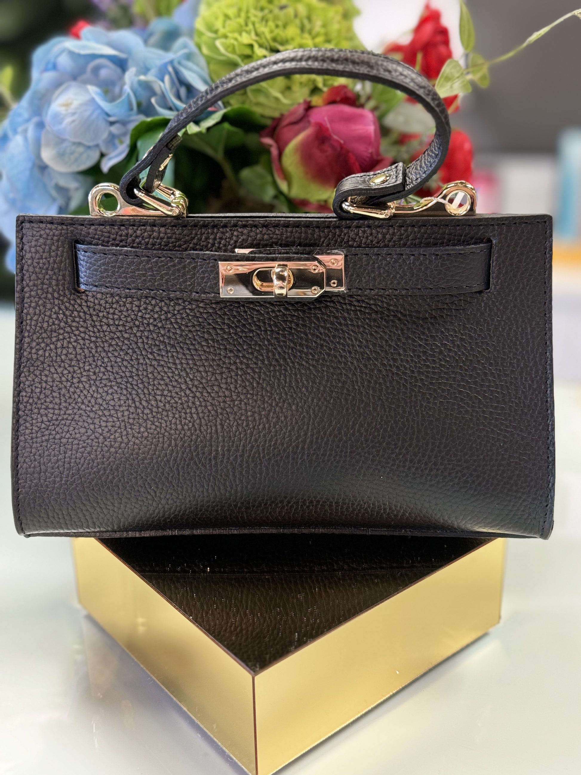 This bag is the perfect little bag but big enough to hold a phone, keys, small wallet and your lipstick! It is handmade in Italy, 100% genuine pebbled leather. It has a gold chain included for crossbody.