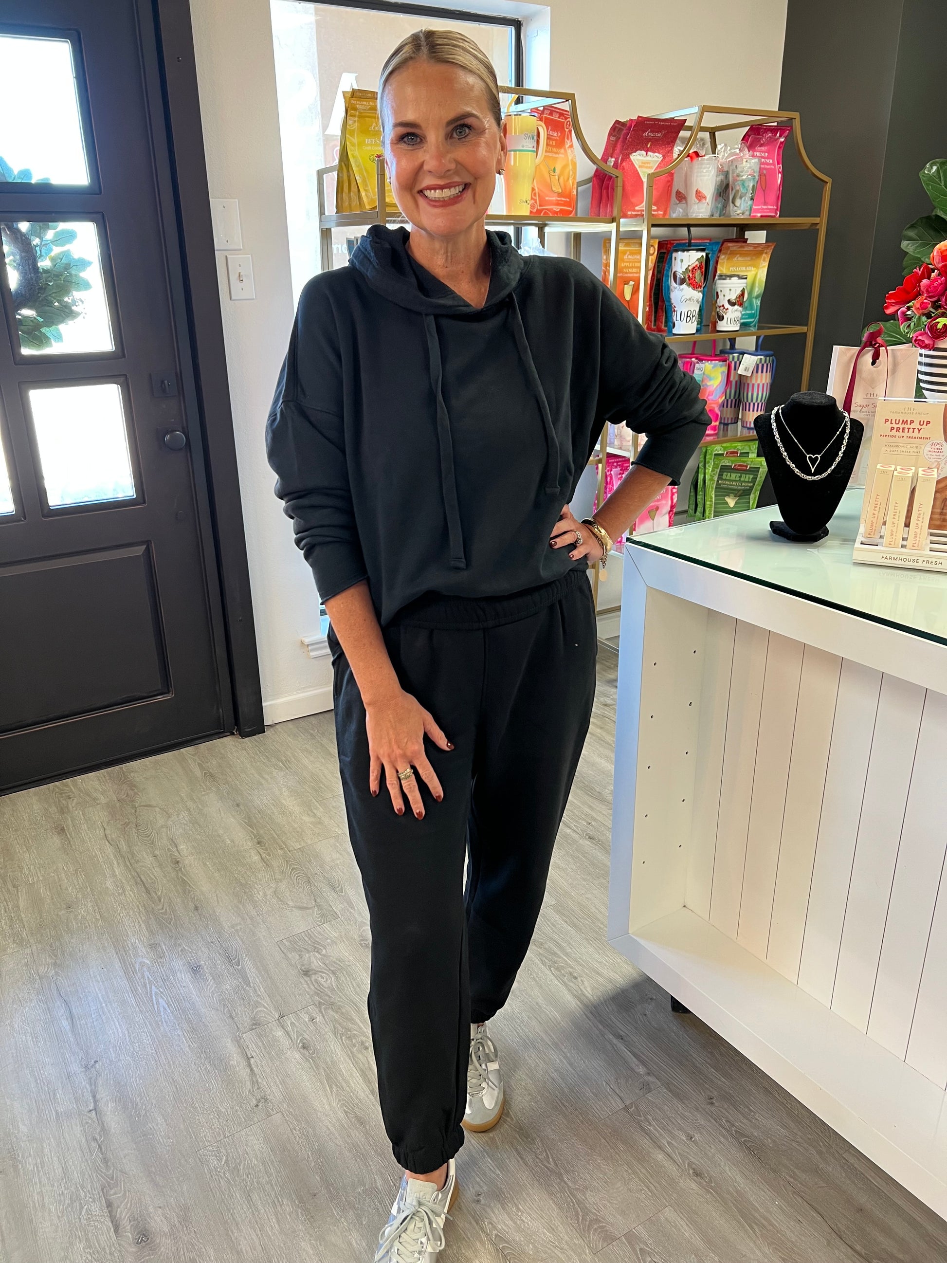 The perfect shade of black our favorite travel set. The top has a rounded bottom hem for a perfect front tuck, a hood and is made of the softest cotton.