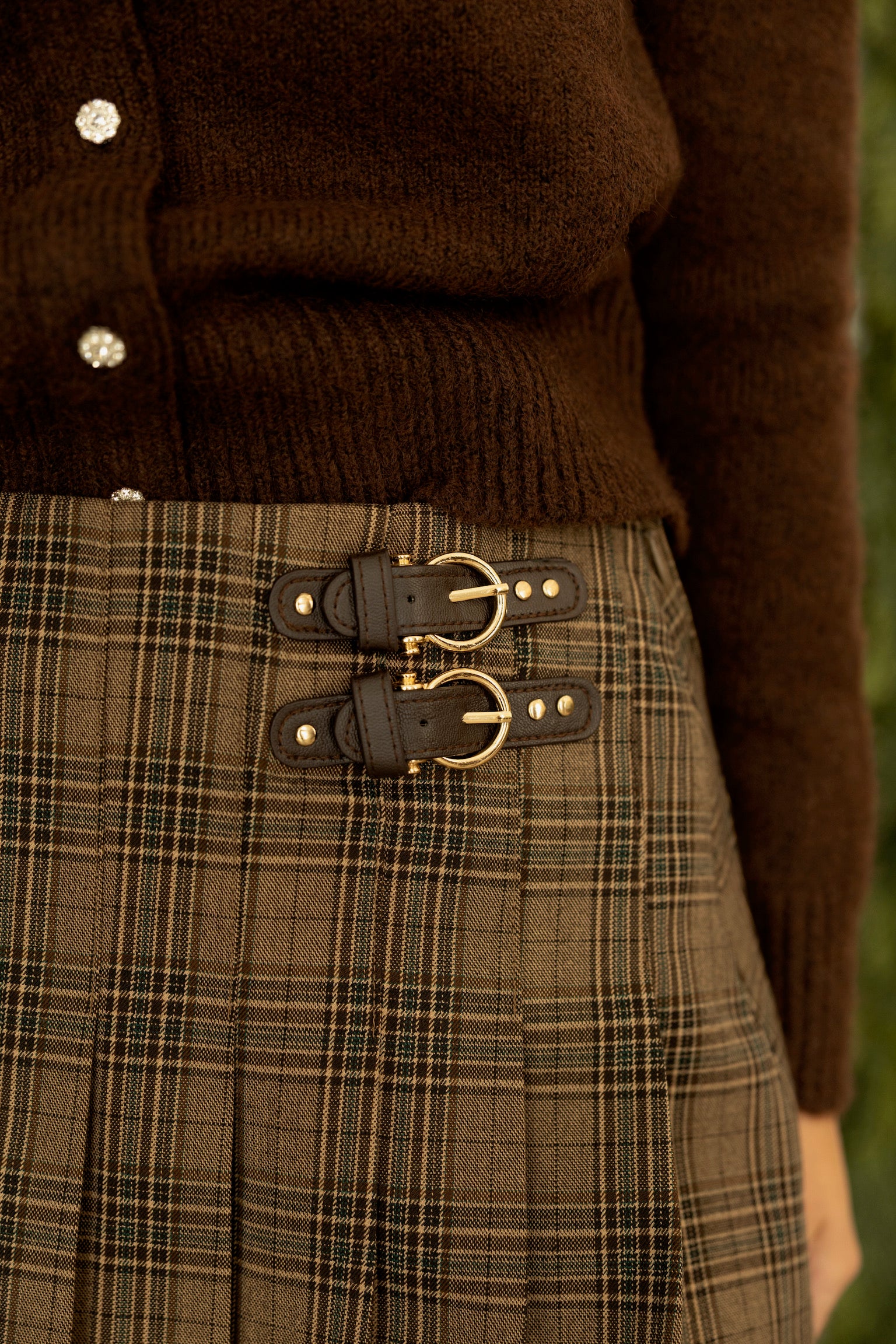 Brown plaid mini skirt with adorable buckle detail.