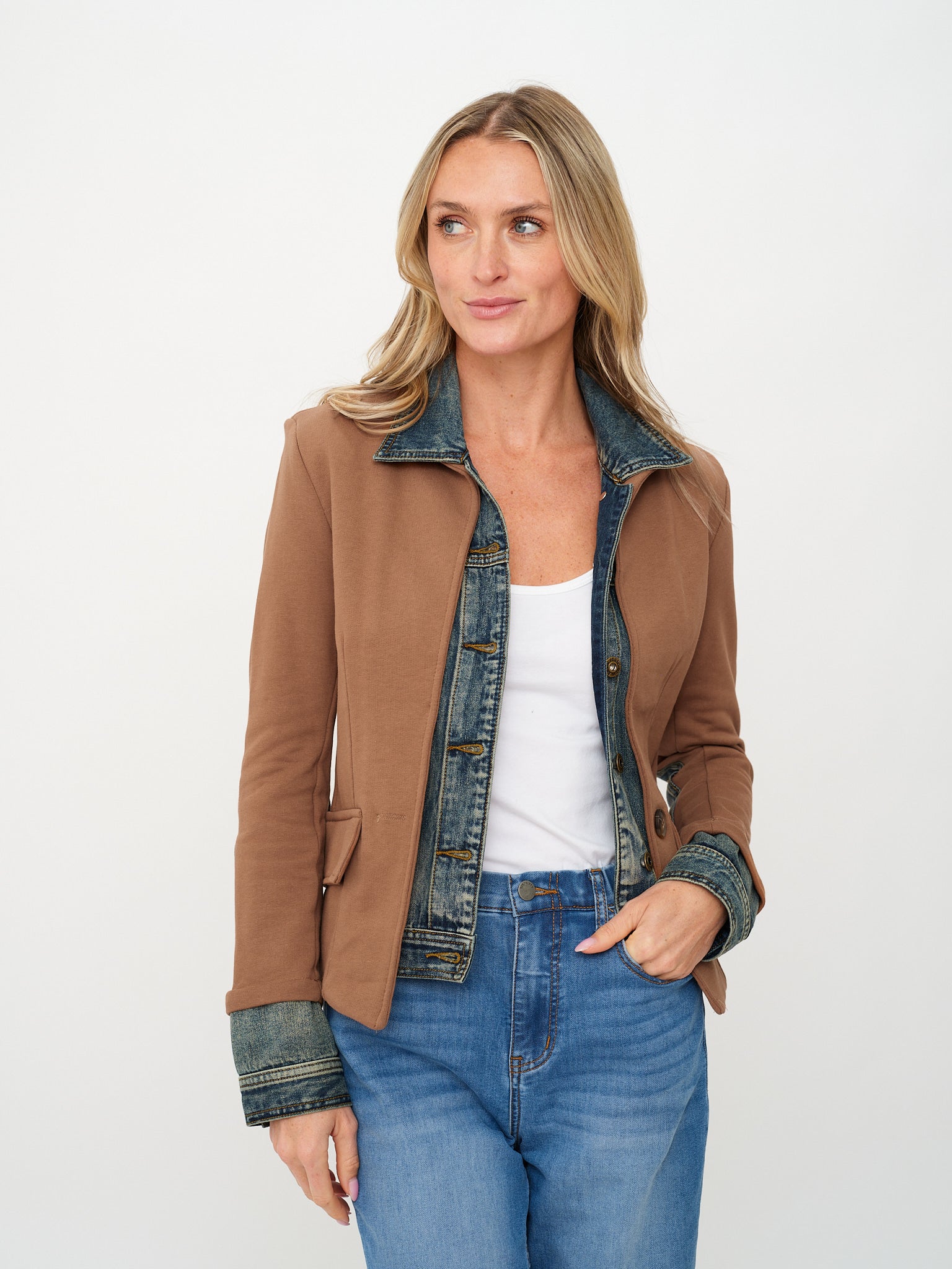 Mixed media is always on trend. The look of layers without the bulk. This blazer is made of a heavy terry knit with a distressed denim accent. Perfect shade of brown for Fall.