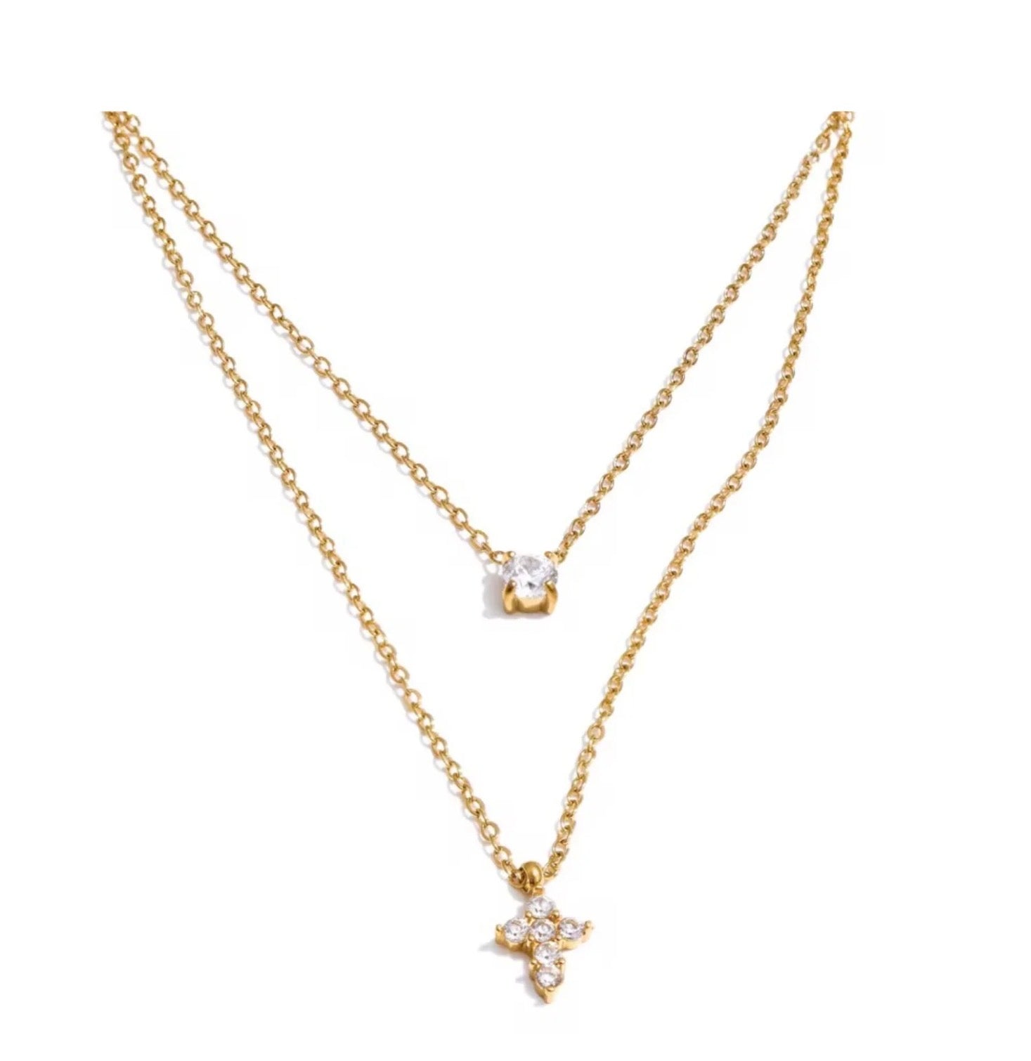 Double layered necklace with a gold solitaire pendant and a rhinestone cross on the longer chain,