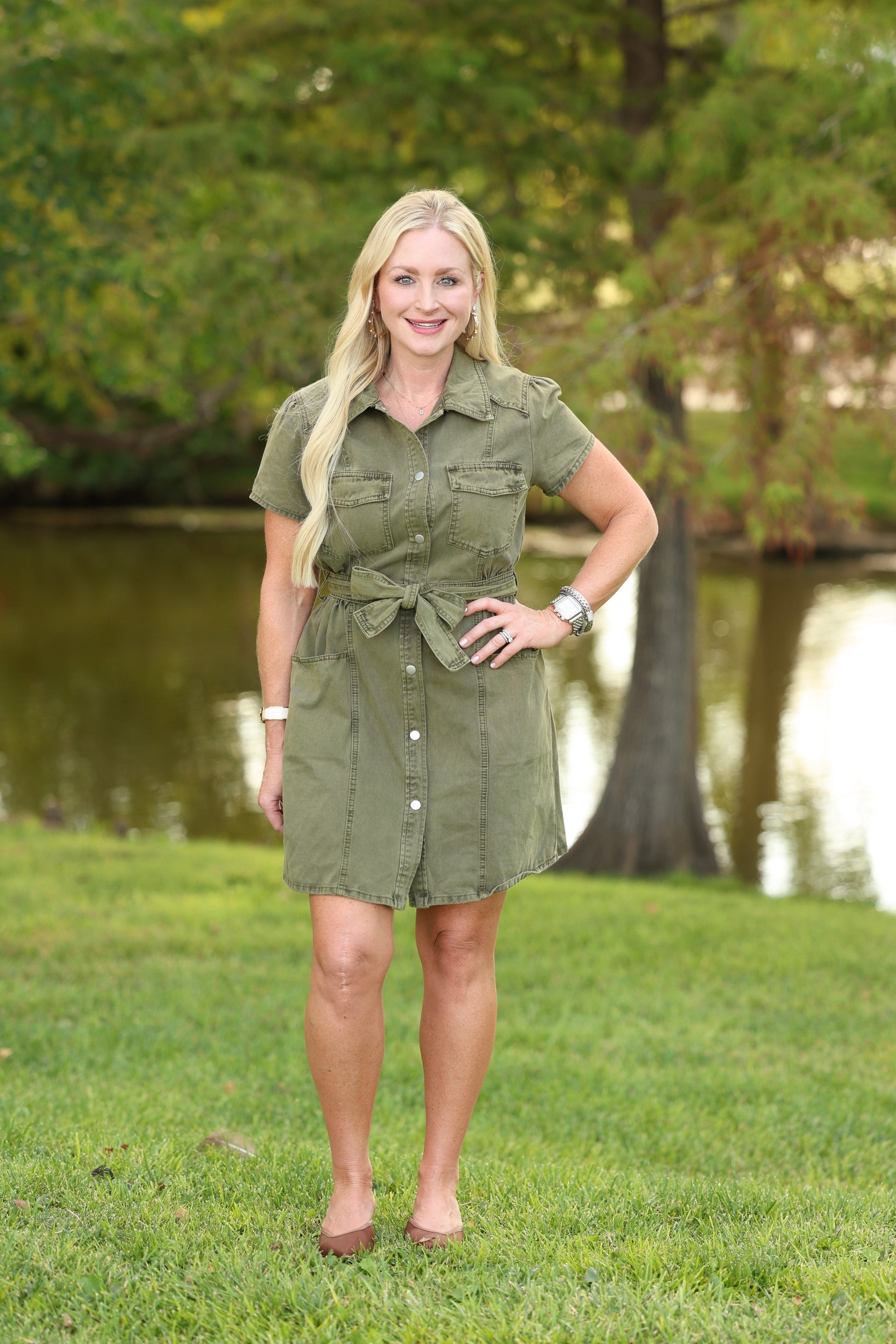 Short sleeve button button down green denim dress with a tie waist.
