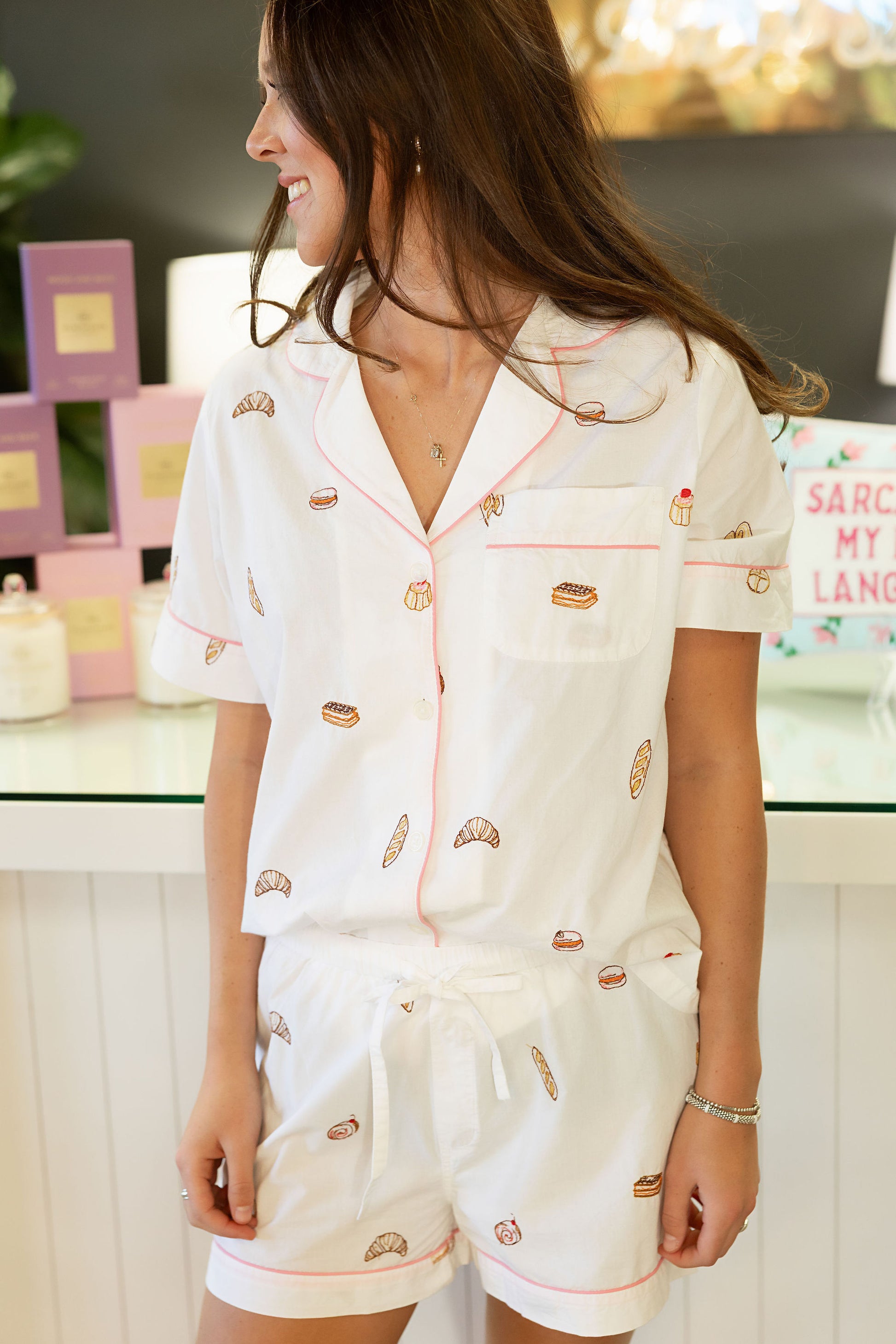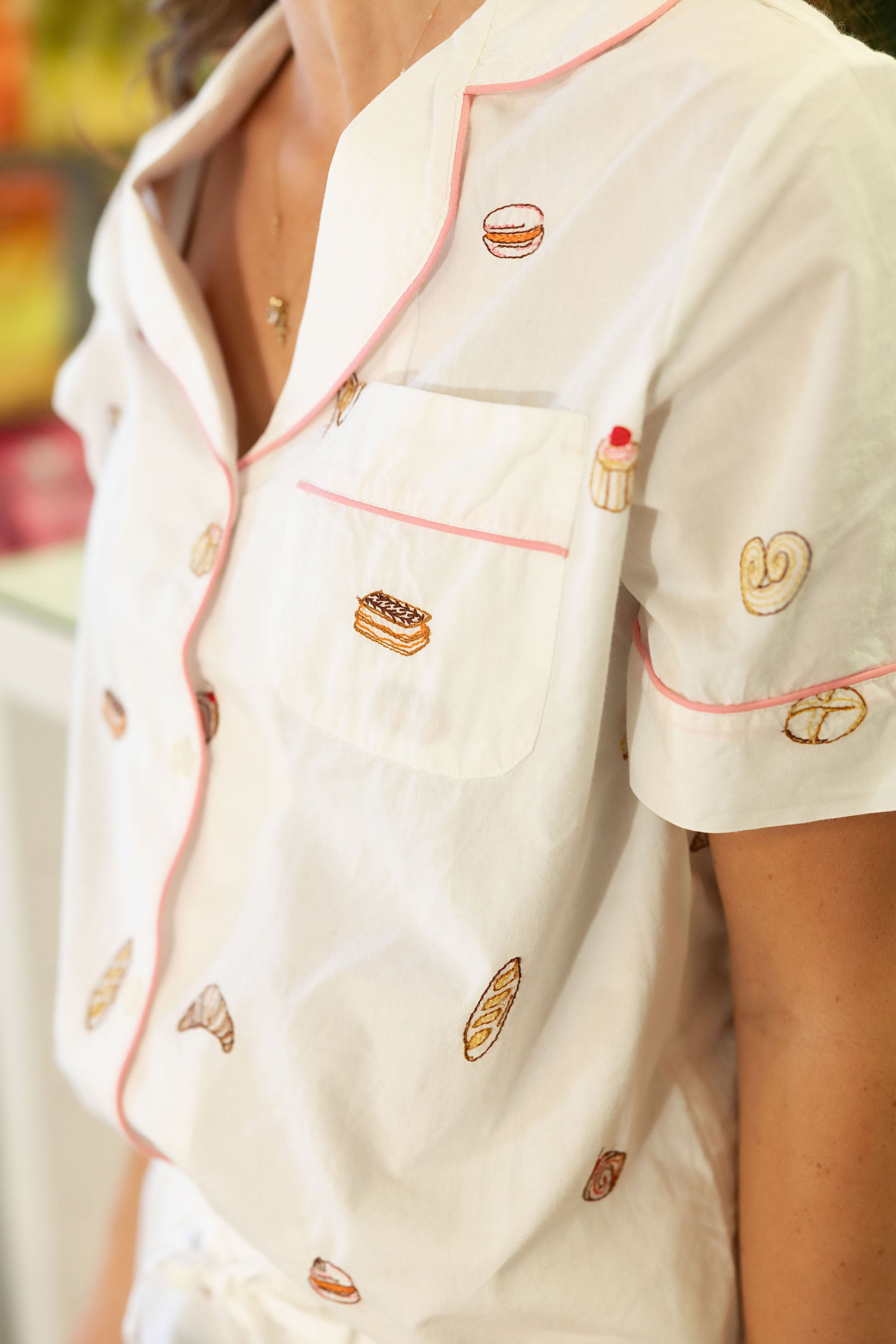 Sweet dreams begin with our Freshly Baked cotton PJ set. This short pajama set features embroidered croissants, cakes, and pastries on breathable organic cotton poplin. The button-down top offers roomy comfort, while the mid-rise shorts feature an adjustable fit. Perfect embroidered pajamas for baking enthusiasts.