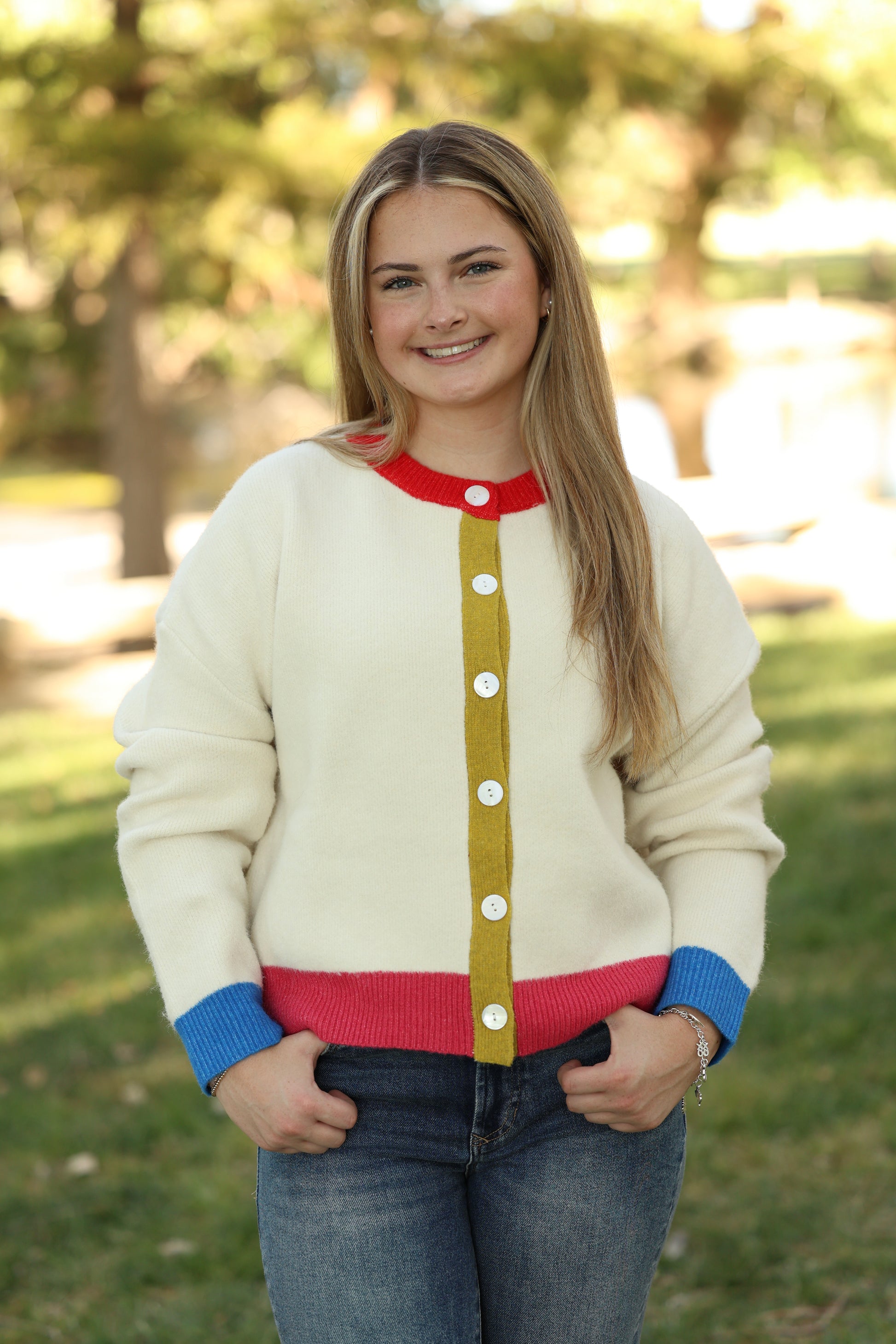 Fun cream sweater with multi color trim.