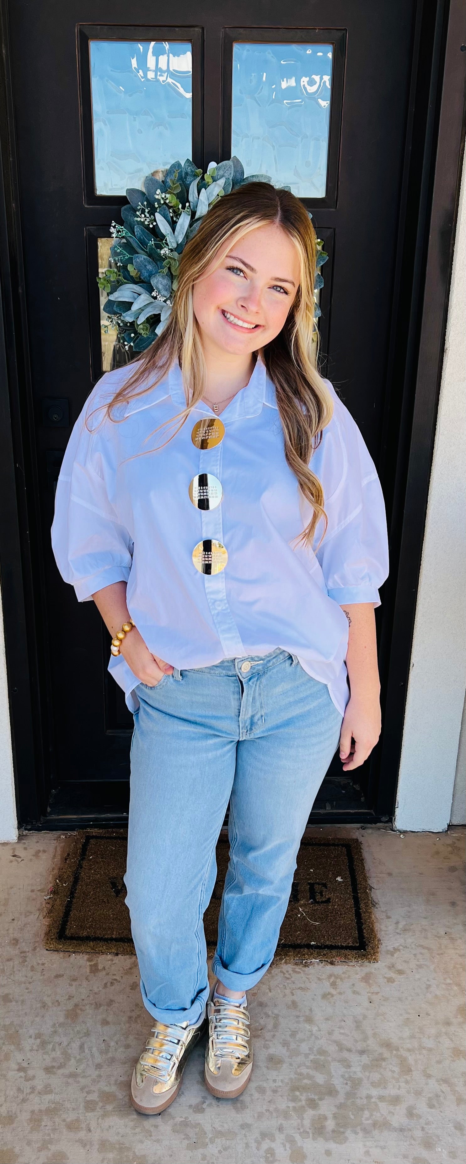 This oversized white button up top with large silver accent buttons is going to be a staple in your closet.