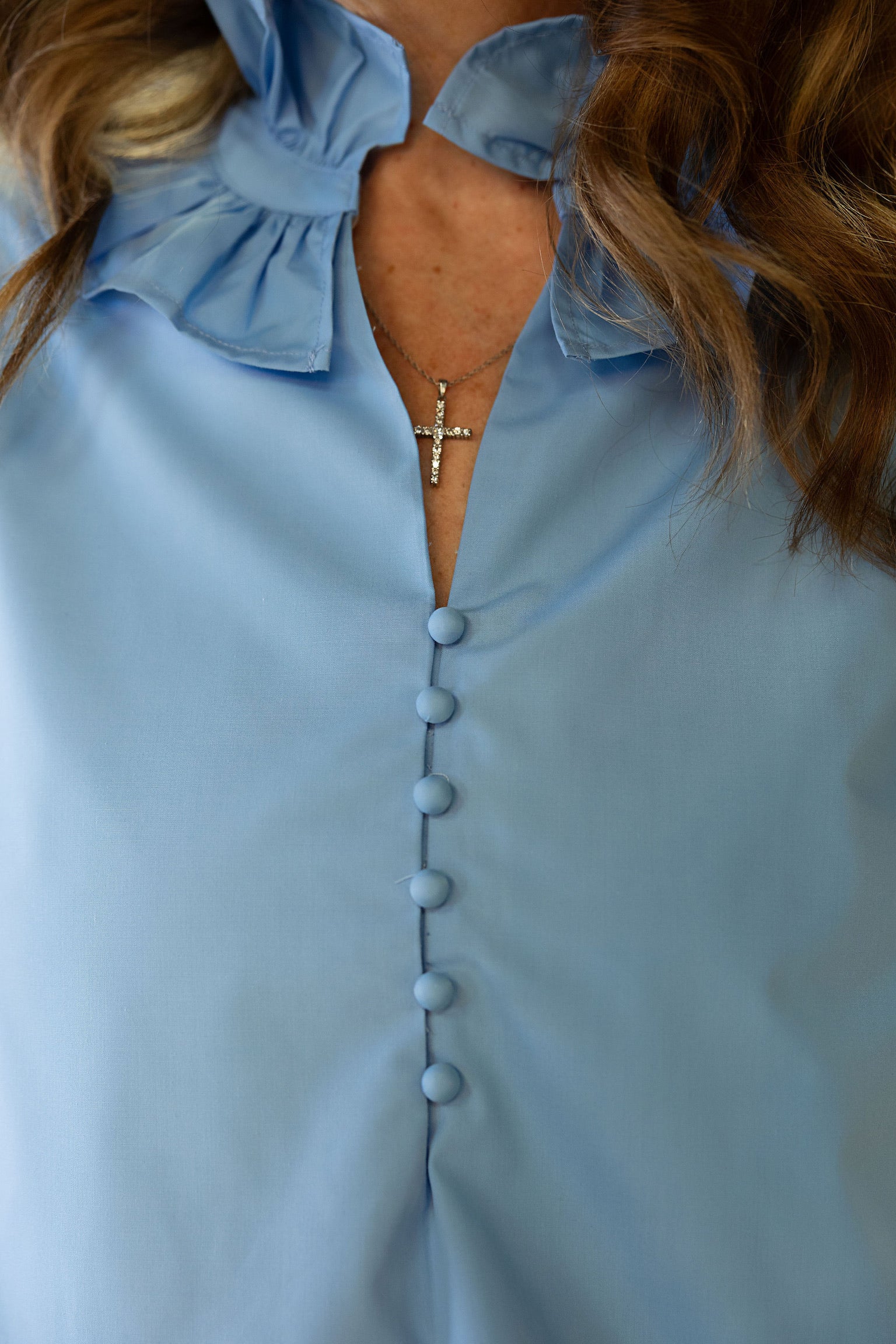 Beautiful blue top with covered buttons and ruffle neck. It will be a great Spring/Summer top.