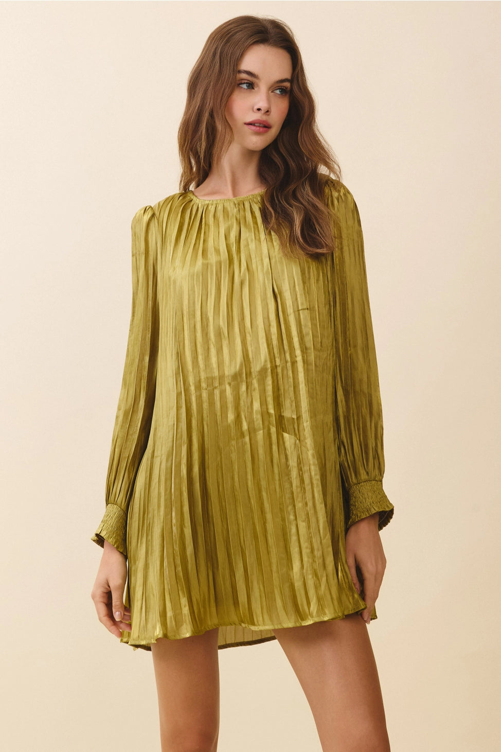 A metallic pleated mini dress featuring long sleeves with smocked cuffs, a relaxed A-line silhouette, and a round neckline with a back keyhole button closure.