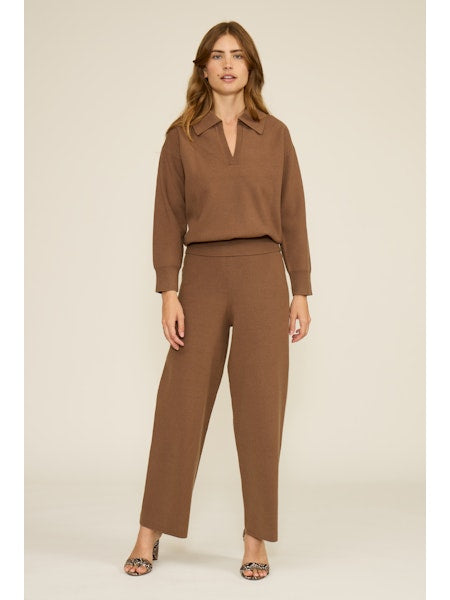 This set comes in a warm brown tone - neutral, rich shade. Pants are a wide leg fit, top is a polo sweater with collar.