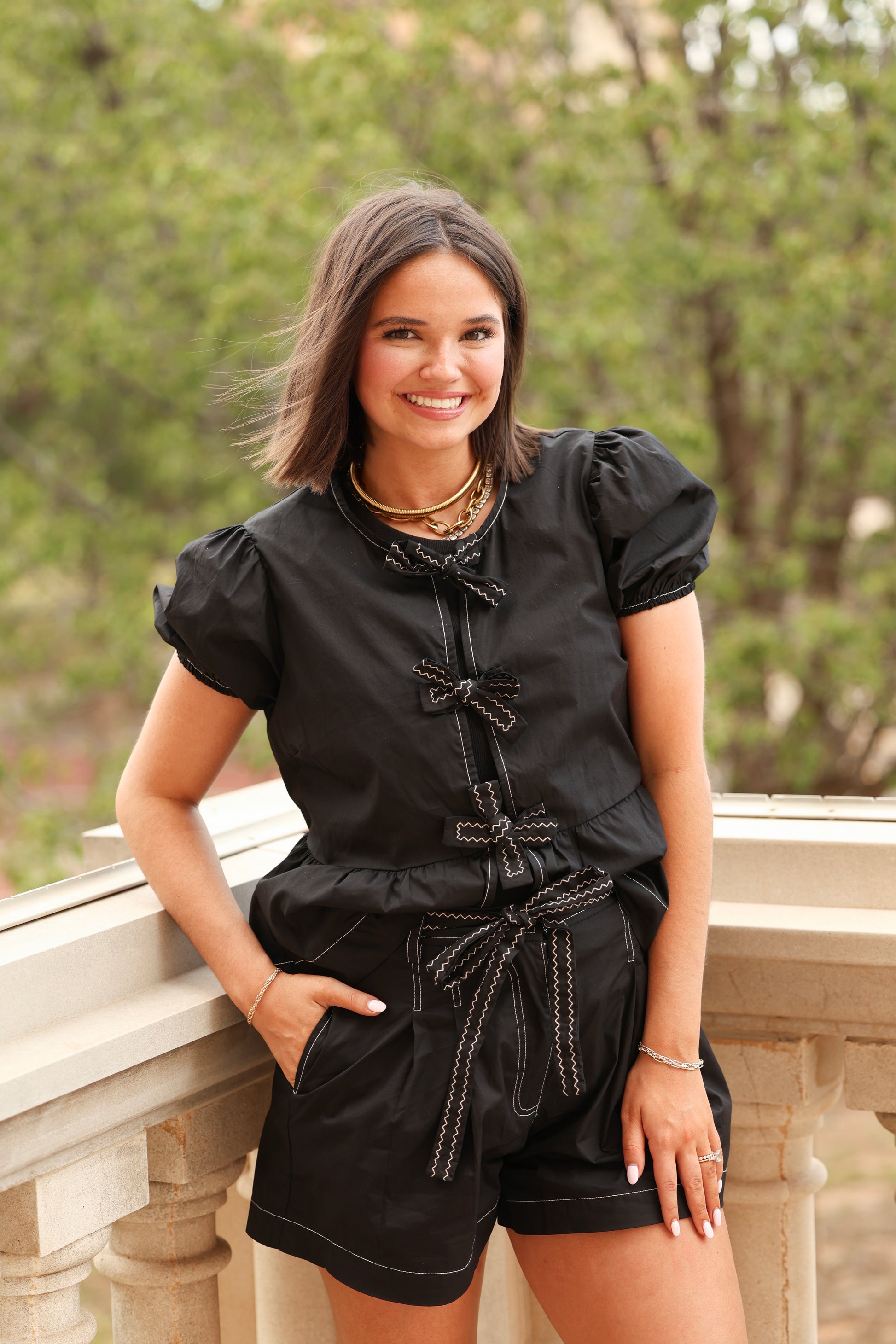 The top is a puff sleeve with front ties that have cream contrast stitching detail. The shorts are a paper bag waist with cream contrast stitching detail. This set is perfectly paired with sandals/sneakers for game day or pair with cowboy boots for a concert!