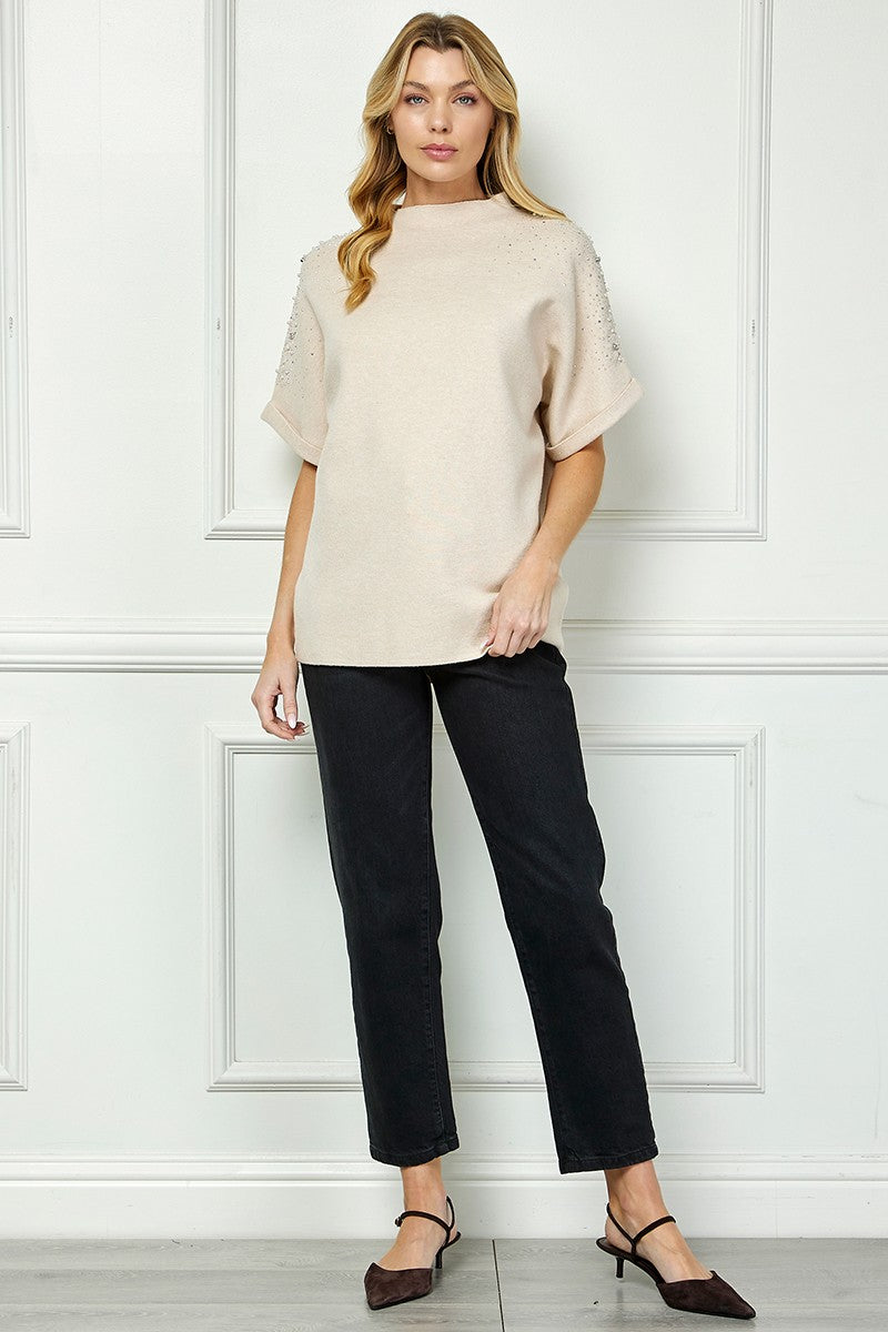 A perfect transition top, a lightweight sweater with a small mock neck and embellished sleeves.