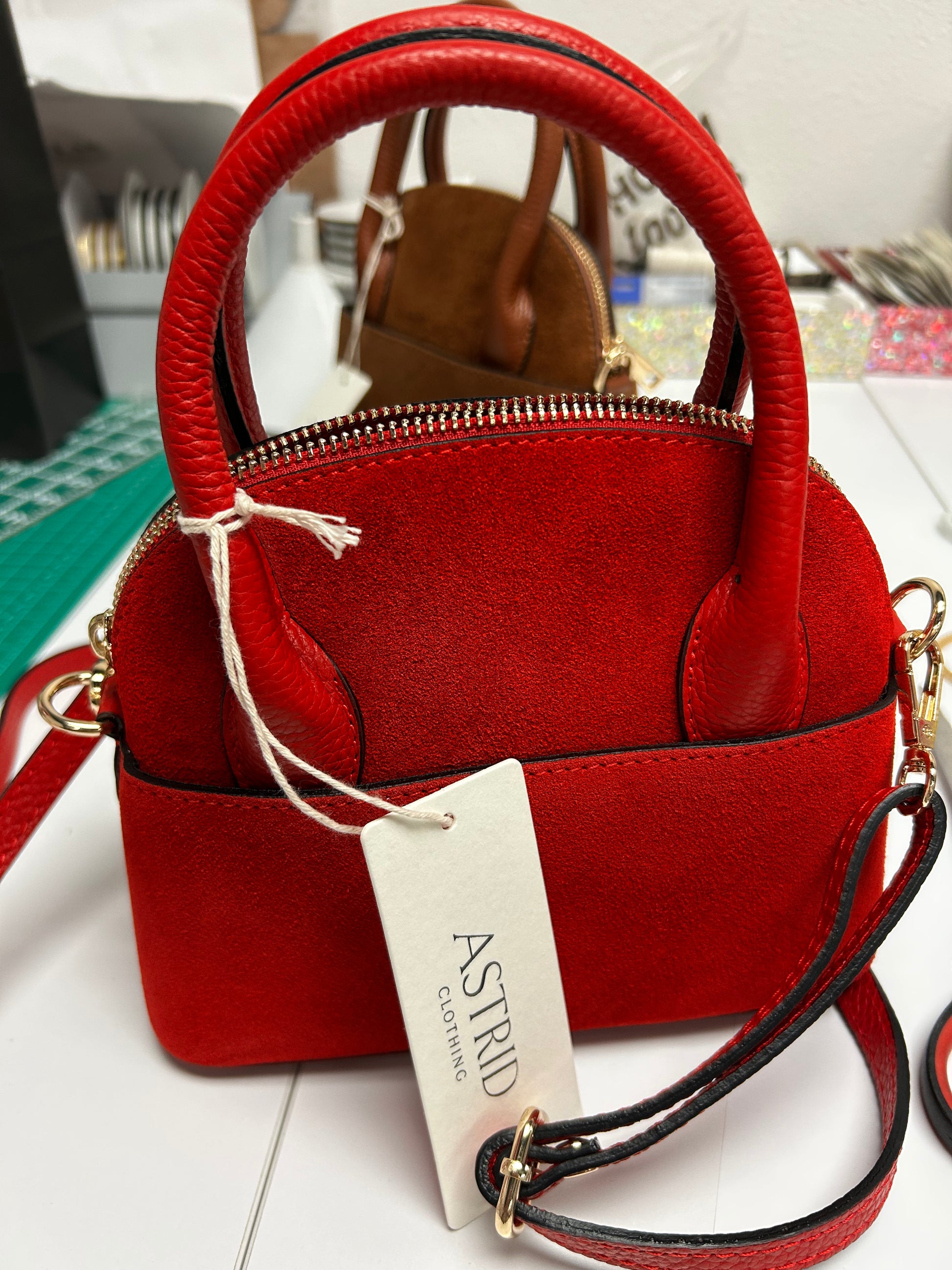 Beautiful brown suede bag with handles and comes with a clip on strap. Just the right size to fit all you need?