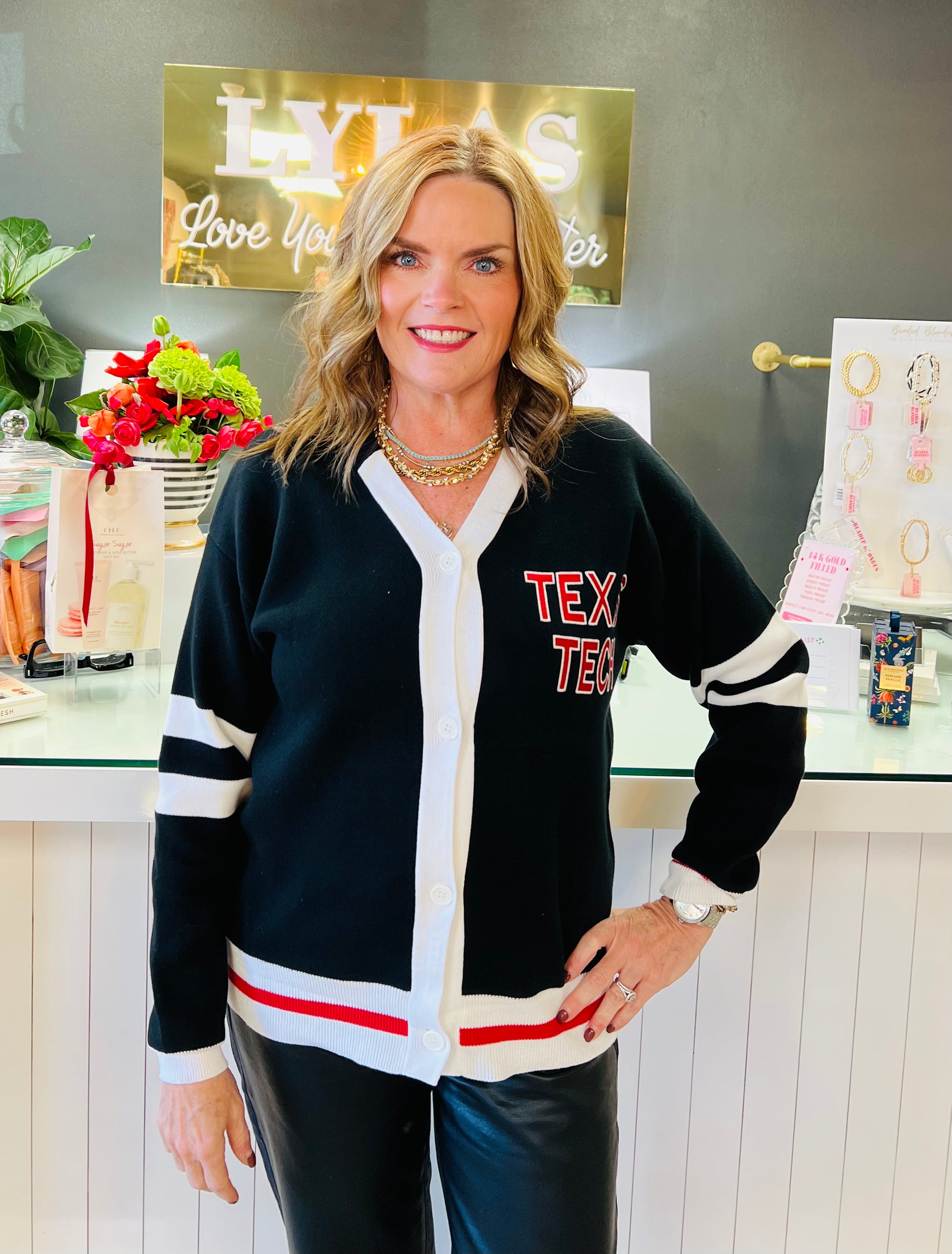 This custom design is only available at LYLAS! A black cardigan with a red double T.