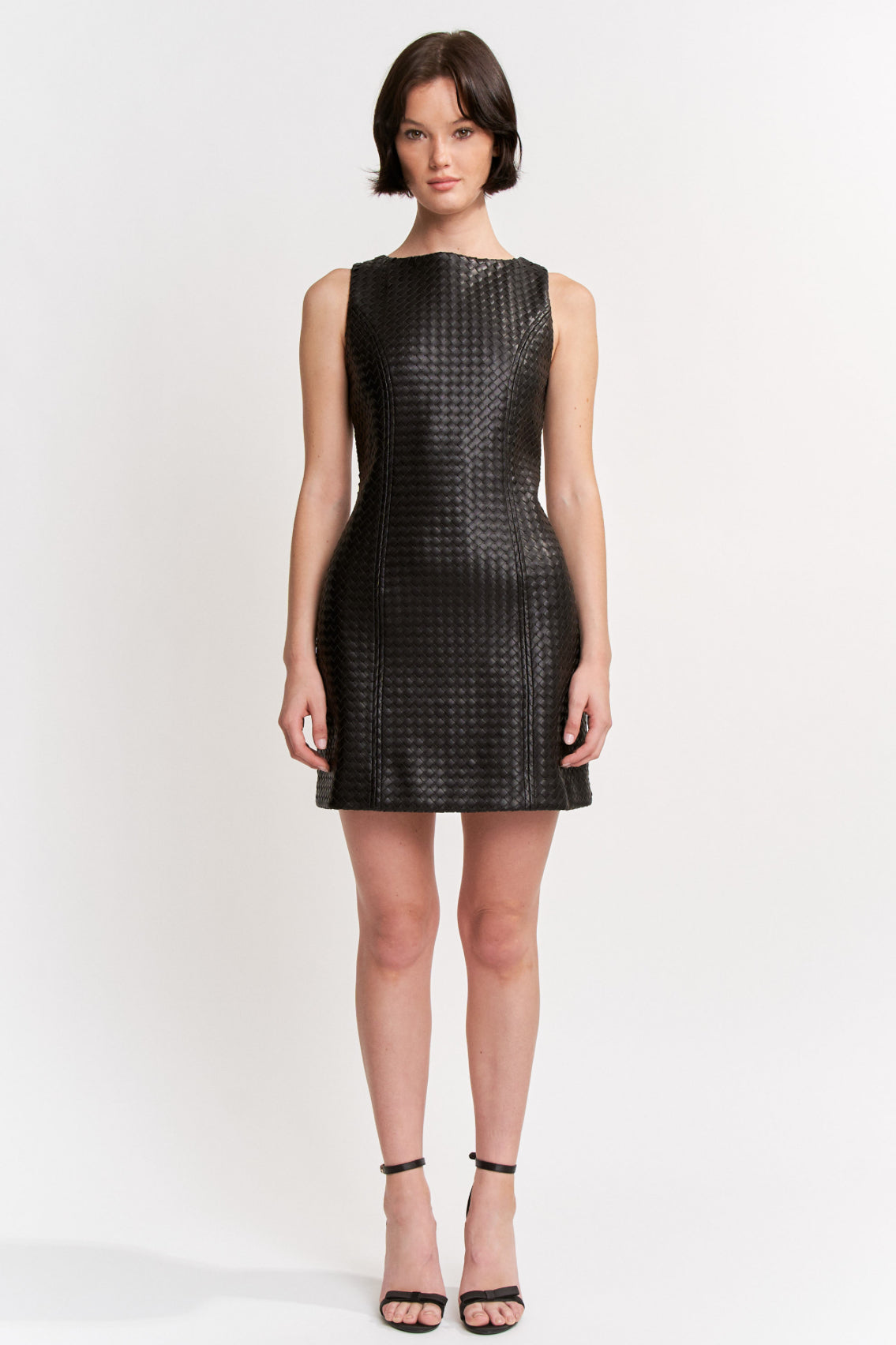 Sleeveless basket weave textured faux leather fitted sheath mini dress.