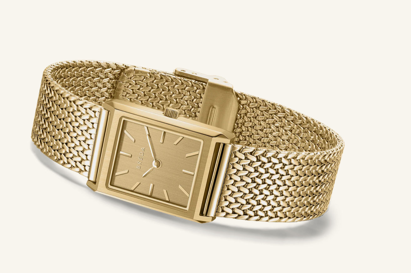 The Tethered Collection exists as a daily reminder of our human connection and our shared memories intertwined, endlessly collapsing together. The Virgil (Tethered) Small features a more compact 20mm rectangle case and is complemented by a gold brushed dial with a woven mesh bracelet that fastens with a quick release clasp.